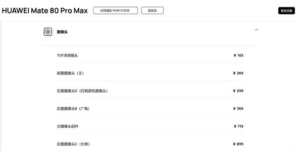 以华为Mate80ProMax为例,屏幕单体(留件价)是1399元;屏幕组件(含屏幕单体、中框、电池)的价格是2909元;电池价格是299元;主板价格是4399元;后壳价格579元;摄像头价格方面,主摄719元,广角369元,长焦899元,红枫镜头299元。对比来看此前发布的Pura80系列,以Pura80Ultra为例,长焦镜头的价格是2899元,一镜双目确实贵是有贵的道理的,而且Pura80Ultra的主摄价格也更贵。